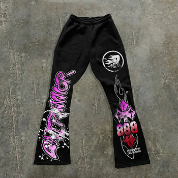 Homens personalizados de Alta Qualidade 100% Algodão Flare Calças Baggy Sweatpants Acabamento Antigo Strass Angústia Plana Worsted Streetwear